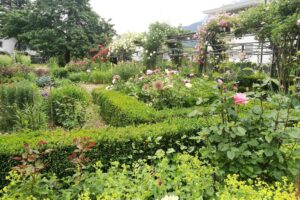 In Maria’s garden vegetables, perennials and roses grow side by side, creating a colorful and lively scene.